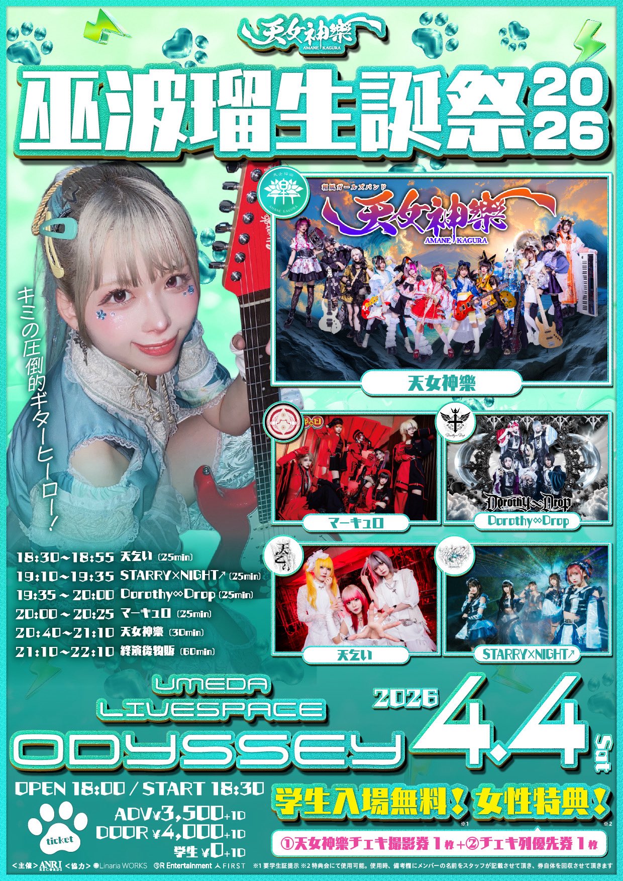 出演:天女神樂(星井あおはサポートギターとして出演します) / Risky Melody / RAIDEN / Illumina from ArkRyal / Qtwins / LUCIDA / HONEYBEE